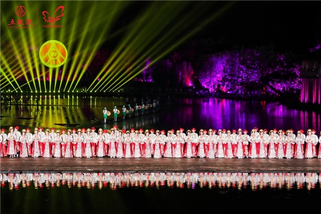 湖光灯影,月色添喜。19:15,百对新人携手步入印象西湖婚典主会场。天为幕、山为景、湖为台,3000多枚炫彩灯光变换交织,勾勒出“画中缔良缘”的盛景。百对新人在大型国风仪仗队的引领下登上水上舞台,行三拜大礼、互赠信物,将“敬天地、拜高堂、结同心”的传统婚俗与现代爱情誓言完美融合。杭州市委常委、宣传部部长黄海峰为百对新人主婚,代表杭州市政府和杭州市民向国内外百对新人表示热烈欢迎并送上诚挚祝福;宜宾市人民政府副市长刘勇为百对新人致贺词;杭州市人大常委会秘书长钮俊,共青团浙江省委副书记李莲萍,宜宾五粮液股份有限公司党委副书记、副董事长、总经理华涛,杭州市委宣传部副部长、市文明办主任王文硕,杭州西湖风景名胜区党工委书记、管委会主任孙国方,共青团杭州市委书记汪杰为新人颁发百年好合纪念证书和《中华传世家训》。
