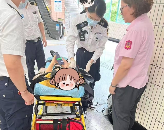 “您好,请问您是不是哪里不舒服?需要帮忙吗?”张瑾轻声询问,并保持着温和的态度以缓解乘客的紧张情绪。女乘客缓缓抬起头,虚弱地表示自己突然感到头晕、恶心,浑身无力。了解情况后,张瑾第一时间通过对讲机通知车站值班员立即拨打120急救电话,并详细告知了乘客的身体状况和所在位置,确保急救人员能快速准确抵达。