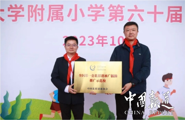 活动现场,中国花样滑冰协会副秘书长向江西师大附小颁发“全国第一套花样滑冰广播操推广示范学校”牌匾,并赠予花滑广播操学练手册。